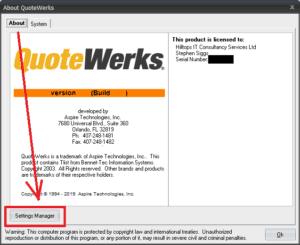 6) Click ‘Ok’ to save the revised Setting, close the Settings Manager and About screens; re-open the QuoteWerks Open screen to see that changes have been applied as expected. If not, then roll back the changes by re-applying the setting copied in Step #4.