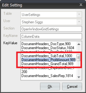 5) The columns are listed in the format DocumentHeaders_[FieldName],[ColumnWidth]. In the example above, I have added the field “ProfitAmount” in between the SubTotal and GrandTotal fields by copy/pasting the GrandTotal line and simply changing the [FieldName] to ProfitAmount. Note that each line in the settings is separated by a carriage return.